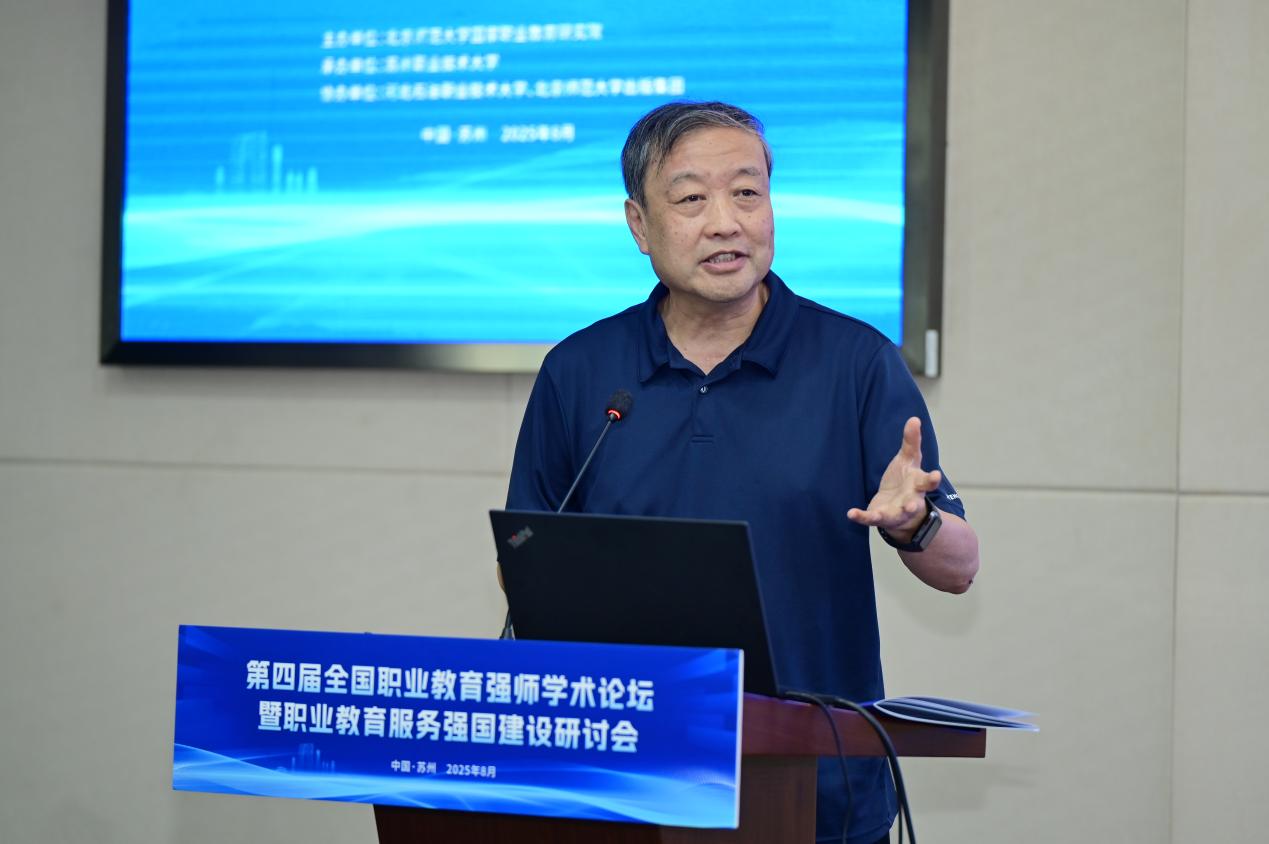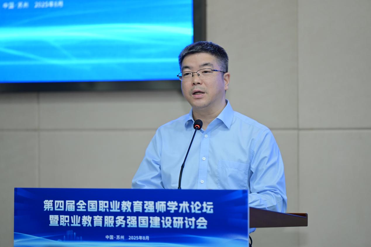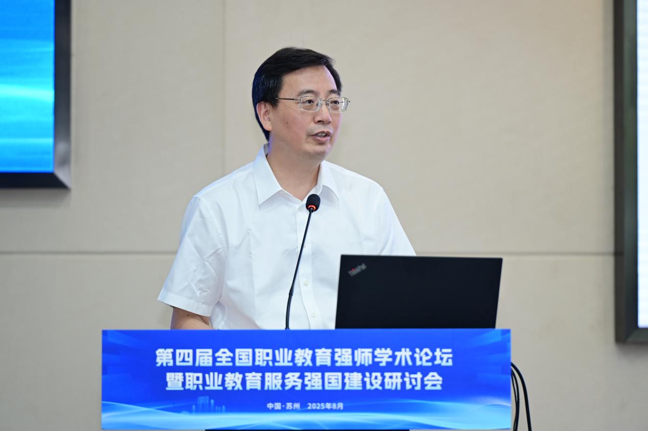 8月16日至17日,第四届全国职业教育强师学术论坛暨职业教育服务强国建设研讨会在苏州职业技术大学举行。本次论坛由北京师范大学国家职业教育研究院主办,苏州职业技术大学承办,河北石油职业技术大学、北京师范大学出版集团协办,苏州吴中经济技术开发区机器人与智能制造产教联合体、全国先进半导体行业产教融合共同体、全国数字低空行业产教融合共同体给予大力支持,并获得全国教育专业学位研究生教育指导委员会职业技术教育领域专家小组指导。苏州市人民政府副秘书长吴旭翔、苏州市委教育工委书记、市教育局局长周志芳、北京师范大学国家职业教育研究院院长和震、国家教育行政学院职业教育研究中心主任邢晖、天津职业技术师范大学原党委书记孟庆国、江苏联合职业技术学院原党委书记刘克勇、浙江金融职业学院原党委书记周建松、南宁师范大学二级教授王屹、教育部职业教育发展中心教师处副处长涂三广、苏州市职业大学党委书记温贻芳、武汉城市职业学院二级教授禹诚等出席论坛。开幕式由和震主持、主旨报告由苏州市职业大学校长陈峻主持。